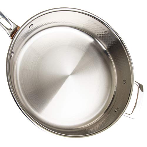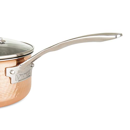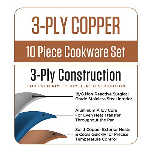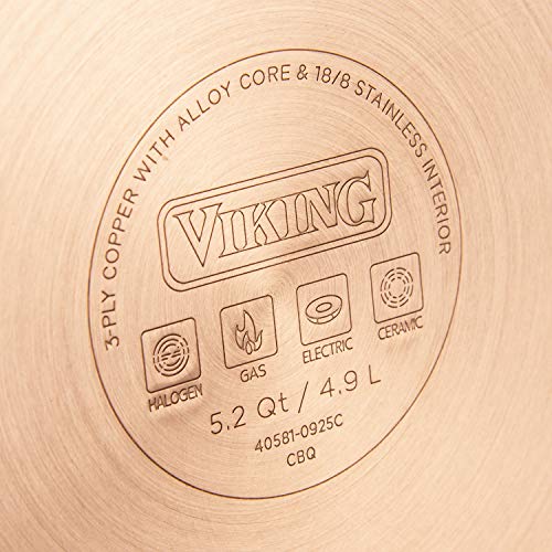 Details: Viking 3-ply stainless steel Copper clad cookware combines a layer of aluminum sandwiched between a Copper exterior and a heavy-gauge stainless steel interior for superior performance. The aluminum core provides exceptional heat transfer throughout the pans, while the Copper exterior heats evenly for precise temperature control. F featuring a flared seamless Rim, The vented glass lids allow you to easily see the progress of your meal while reducing the chance of boil-overs. The Viking signature ergonomic stay-cool handles have a finger guide and built-in Heat break for easy lifting and control, while the internal volume measurements make measuring quick and precise. Pans are oven safe up to 500°f/260°c (up to 400°f/204°c with glass lid). set includes: 8 quart stock pot with glass lid, 5. 2 quart sauté pan with glass lid, 2. 25 quart and 3 quart sauce pans with glass lids, 8 inch and 10 inch fry pans. Compatible with all cooking surfaces, except induction.